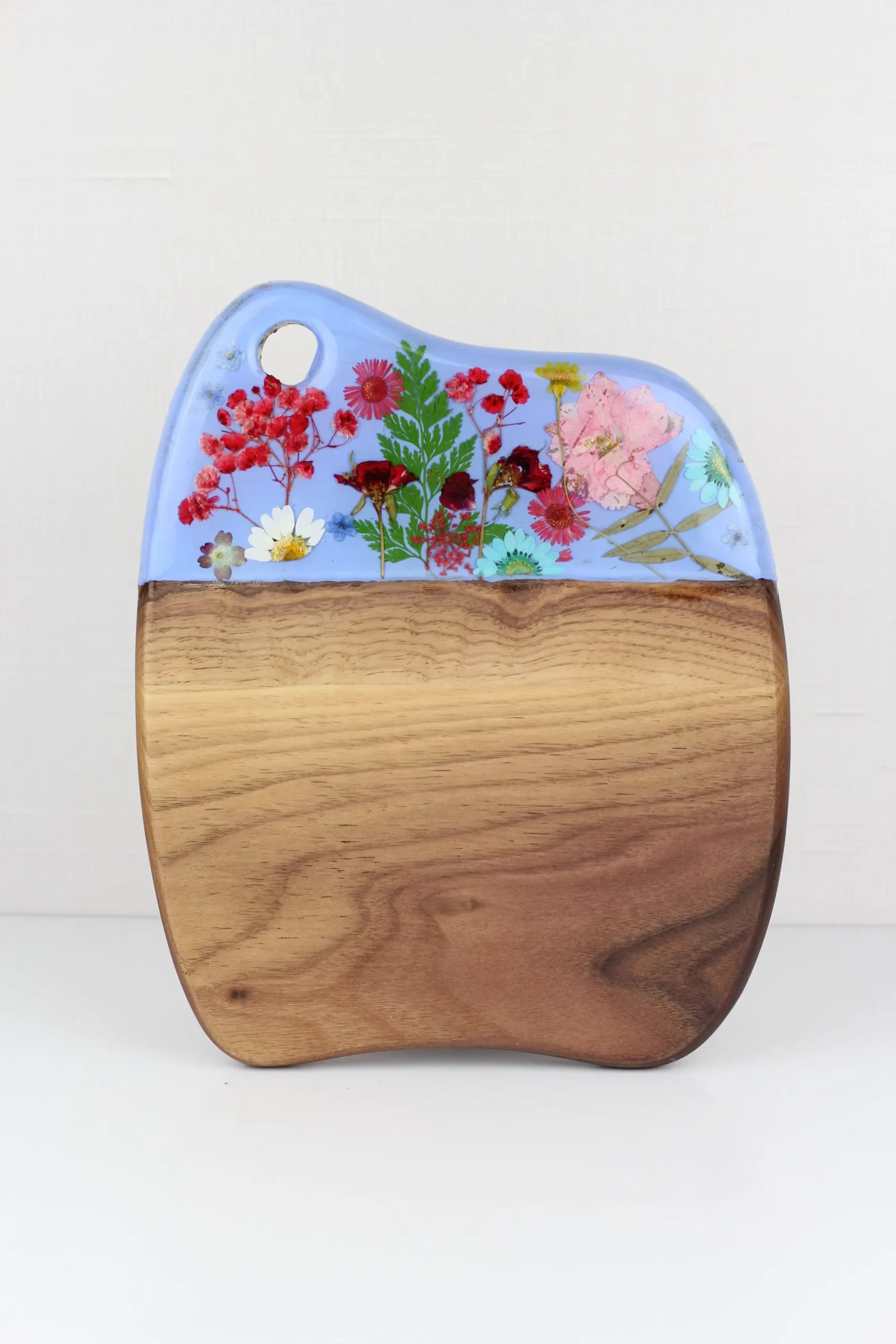 TalkingThyme’s Floral Cheese Board showcases the natural beauty of sustainably procured walnut and acacia wood. The smooth surface is adorned with delicate, dried and hand-pressed real wildflowers grown in California, preserved in high quality food safe and heat resistant Resin.