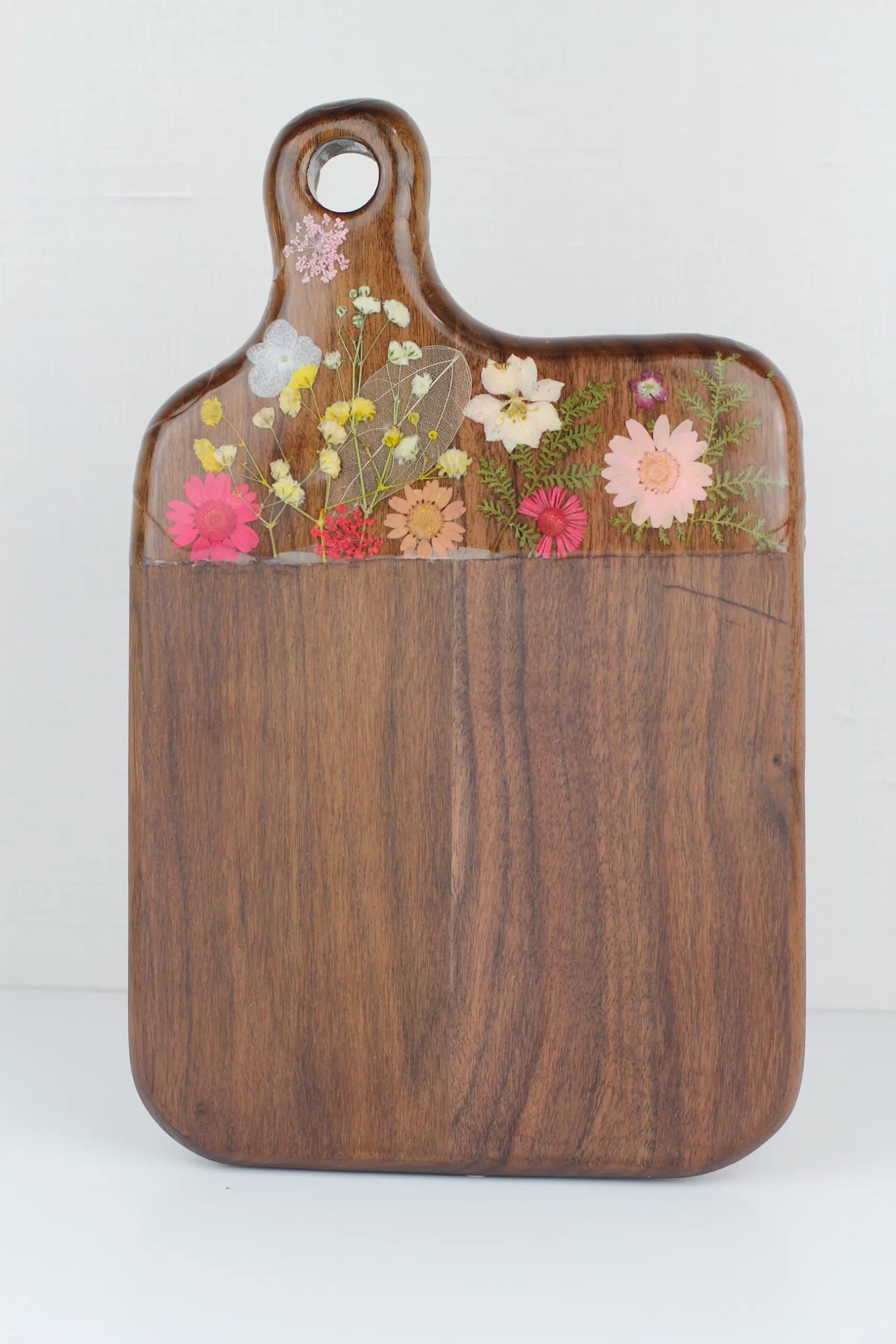They are all made with walnut wood which has a dark unique grain structure and smooth surface to feel. Each board has several resin layers poured on the wood to preserve the dried flowers on the 1/4 to ½ of the board. Leaving some wood portion un resin-ed to cutting/chopping purpose.They are medium sized boards best used for serving food such as cheese, meat and appetizers. They can withstand heat and all of them are food safe.