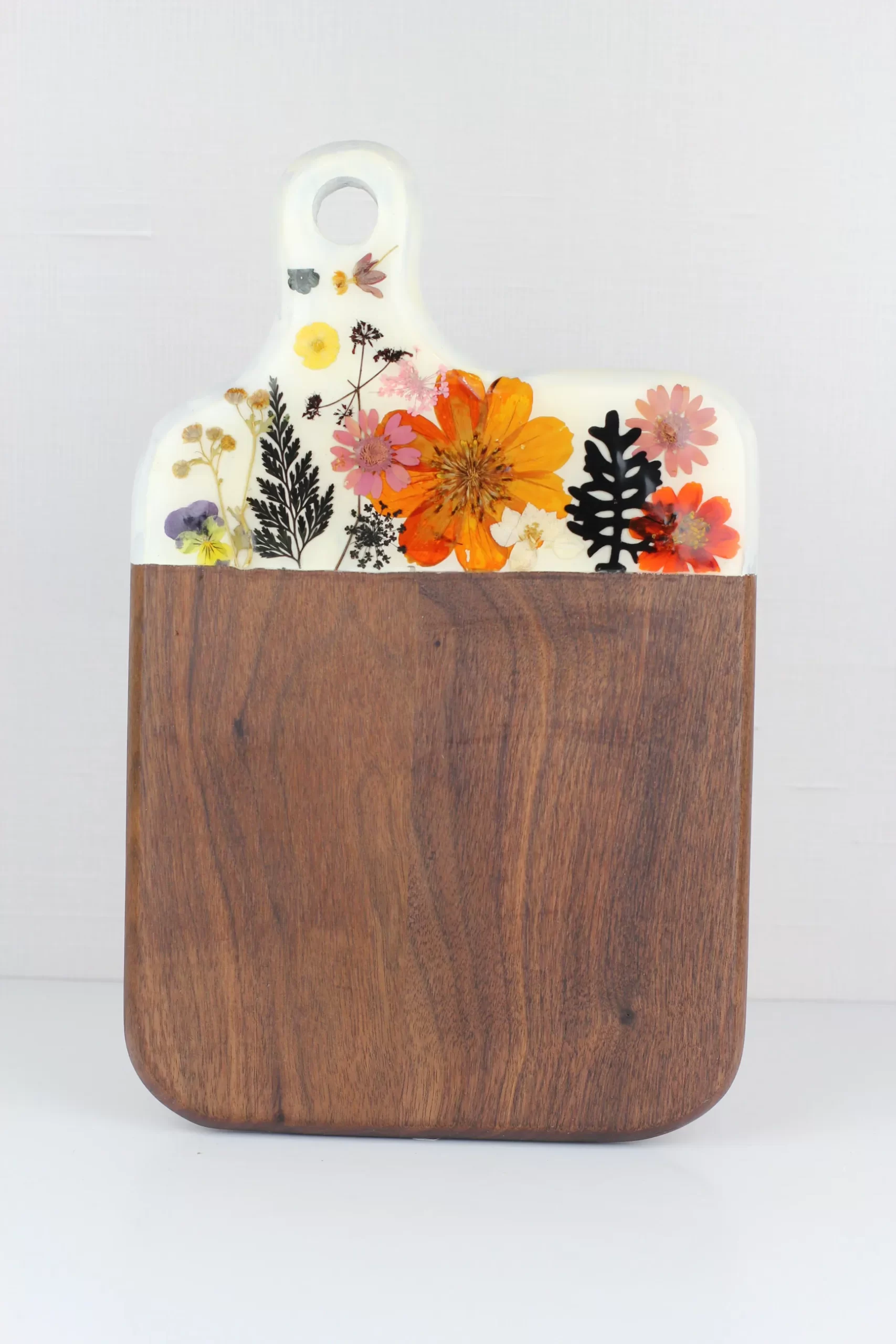They are all made with walnut wood which has a dark unique grain structure and smooth surface to feel. Each board has several resin layers poured on the wood to preserve the dried flowers on the 1/4 to ½ of the board. Leaving some wood portion un resin-ed to cutting/chopping purpose.They are medium sized boards best used for serving food such as cheese, meat and appetizers. They can withstand heat and all of them are food safe.