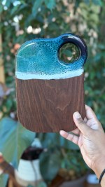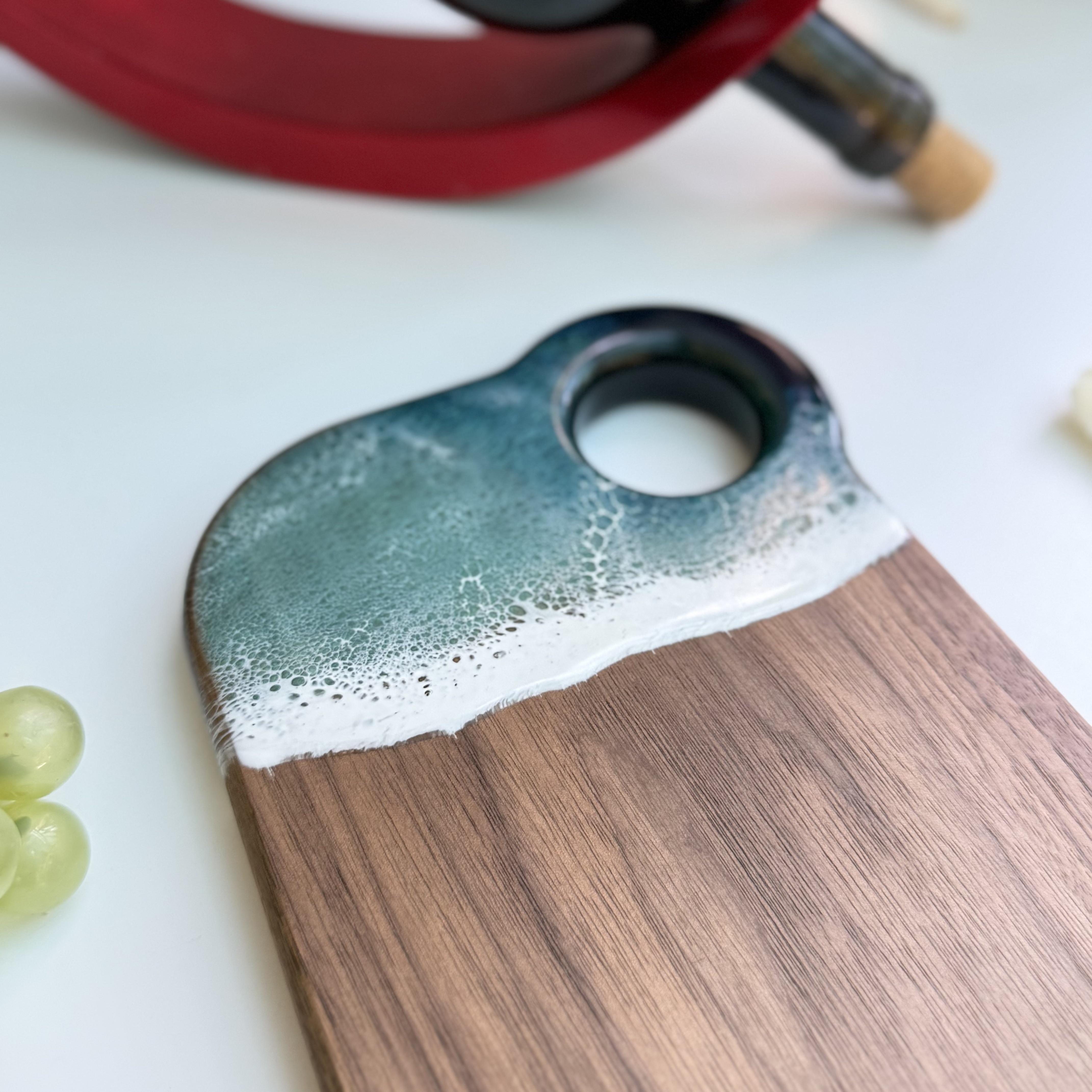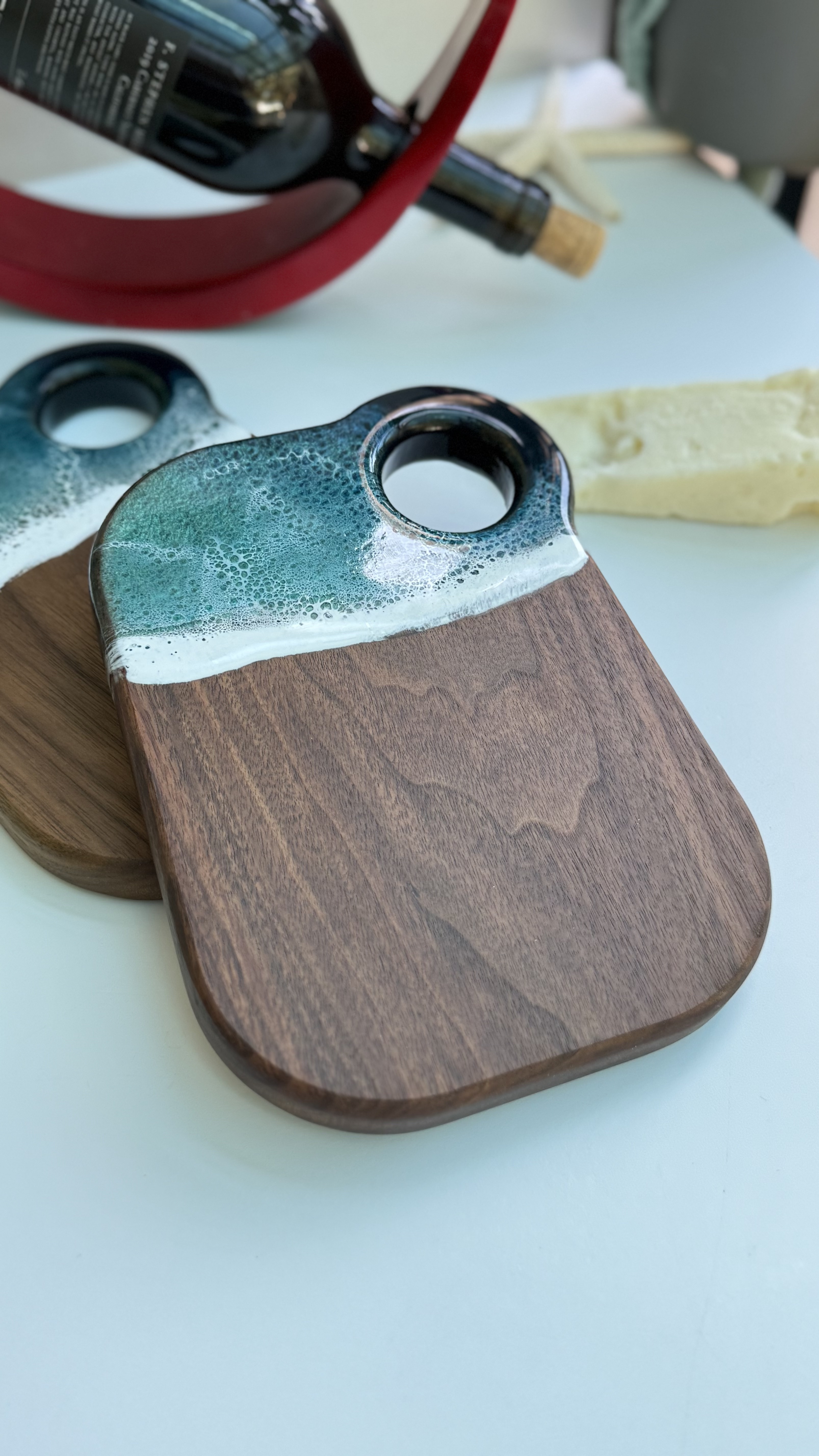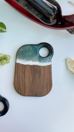 The TalkingThyme 5” x 8” Ocean Resin Mini Cheese Board is handcrafted from walnut wood and finished with a safe, plant-based resin that is food-safe, VOC-free, and heat resistant. Compact yet versatile, this board is ideal for small servings, appetizers, or decorative kitchen use as Spoon rest, desert plate and so on. Every wave is uniquely hand-poured, ensuring no two boards are alike. Personalized engraving options make it a perfect holiday gift, wedding keepsake, housewarming present, or realtor closing gift. All boards come beautifully gift-wrapped and ship nationwide.